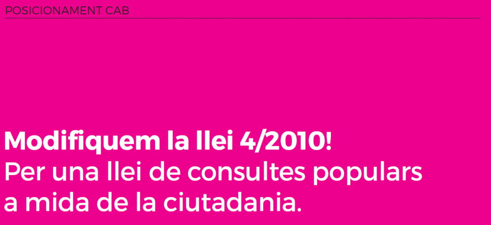 Per això, des del CAB, en el marc de la darrera assemblea vam aprovar aquest posicionament on proposem modificar l’article 38 de la llei 4/2010 del Parlament de Catalunya (Llei de consultes populars per via de referèndum) i instem a l'Ajuntament a efectuar de manera immediata, un cop aprovat el nou reglament de participació, una declaració institucional comprometent-se a treballar per la modificació de l’article 38 de la llei 4/2010 del Parlament de Catalunya.