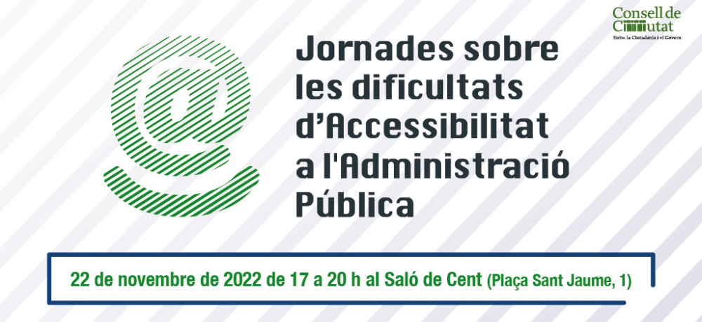 La Jornada “Dificultats d'accessibilitat a l'administració pública” organitzada pel Consell de Ciutat de Barcelona tindrà lloc el pròxim dia 22 de novembre de 17:00 a 20:00 hores al Salo de Cent de l'Ajuntament de Barcelona (plaça Sant Jaume, 1)
