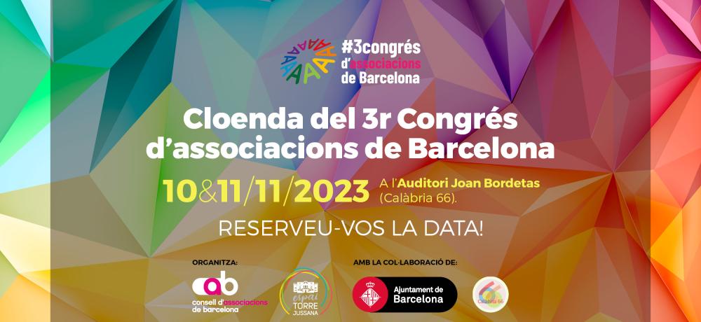 El 10 i 11 de novembre tenim una cita amb l’associacionisme de Barcelona. Us animem a reservar-vos aquestes dates per celebrar la Cloenda del 3r Congrés d’associacions de Barcelona a l’Auditori Joan Bordetas (a Calàbria 66).
