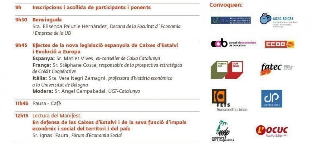 Demà interessant jornada: de Caixes a Bancs la fi del compromís amb la societat? el 21/01/2010 a les 09:00 al 21/12/2010 a les 14:00 Lloc: Facultat d'Economia de la UB. Us podeu inscriure en aquest enllaç Convoquen: ADES (Associació pel desenvolupament de l'Economia Social), AICEC-ADICAE (Associació d'usuaris de bancs, caixes i assegurances), CAB (Consell d'Associacions de Barcelona), CCOO de Catalunya, CONFAVC (Confederació d'Associacions Veïnals de Catalunya), FATEC (Federació d'Associacions de Gent Gran de Catalunya), FETS - Finançament Ètic i Solidari, Fòrum de l'Economia Social, Justícia i Pau, L'OCUC (L'Organització de Consumidors i Usuaris de Catalunya), MLP (Moviment Laic i Progressista), Òmnium Cultural, Taula d'entitats del Tercer Sector Social de Catalunya, UCC (Unió de Consumidors de Catalunya), UGT de Catalunya